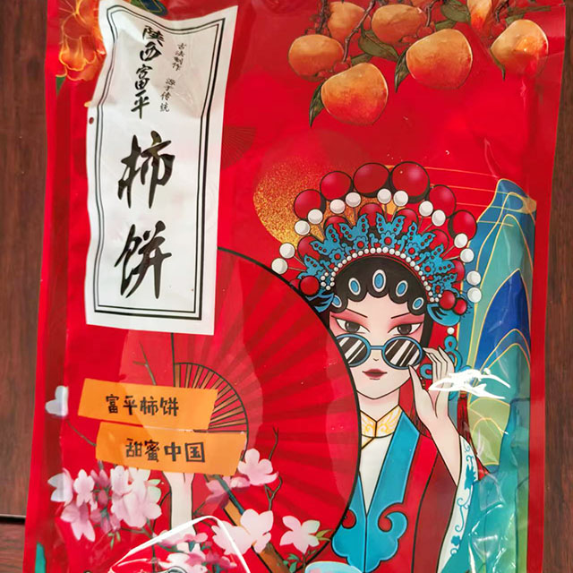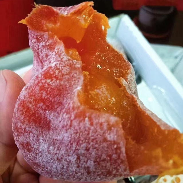 ·外观:柿饼本身呈深橘红色,外披一层厚薄不均的自然白霜。