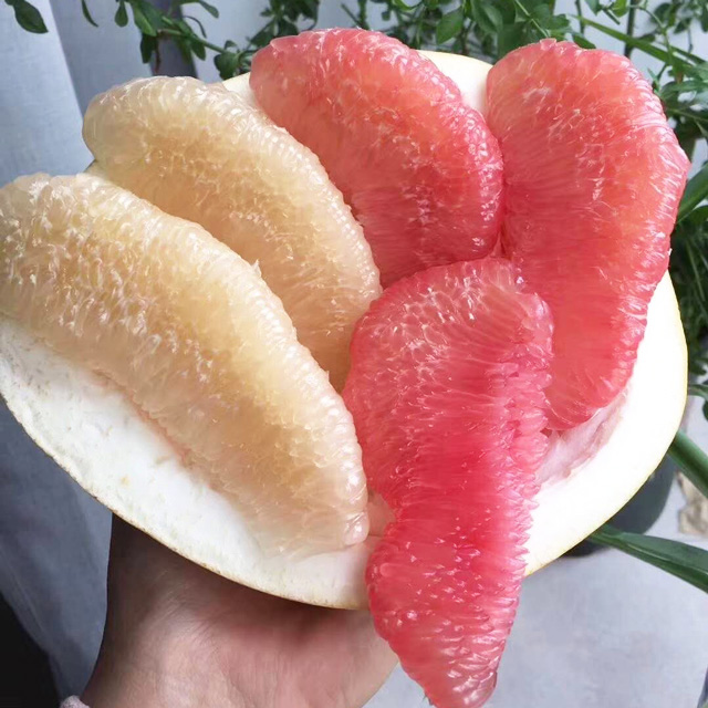 三红蜜柚:皮色淡红,瓤红肉红,纤维口感像红心柚,肉质细嫩清甜。降血脂效果比白柚更强。