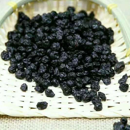 蓝莓干果实较小,呈圆形,没有根蒂,底部有个小坑。吃起来果皮薄,子很小,甜中带酸。