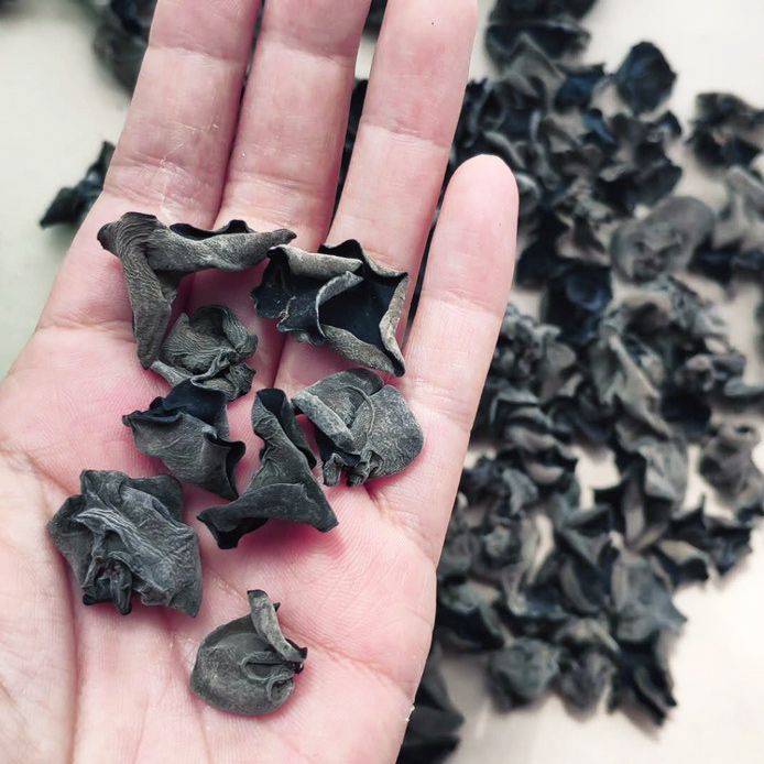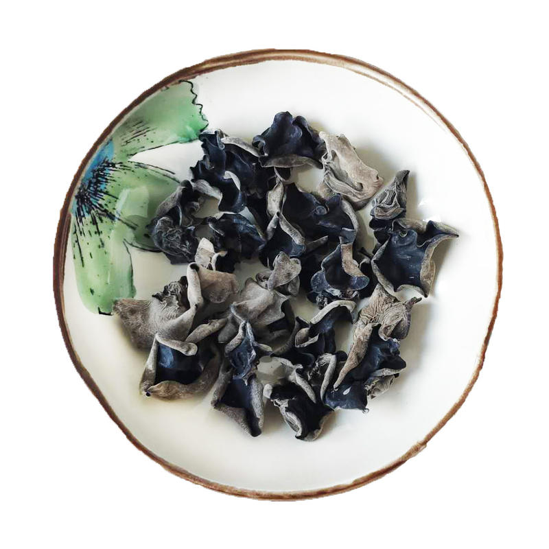 呈深黑色,有光泽,耳背呈暗灰色,无光泽,朵片完整,无结块,易捏碎,无韧性,用舌轻舔无味。
