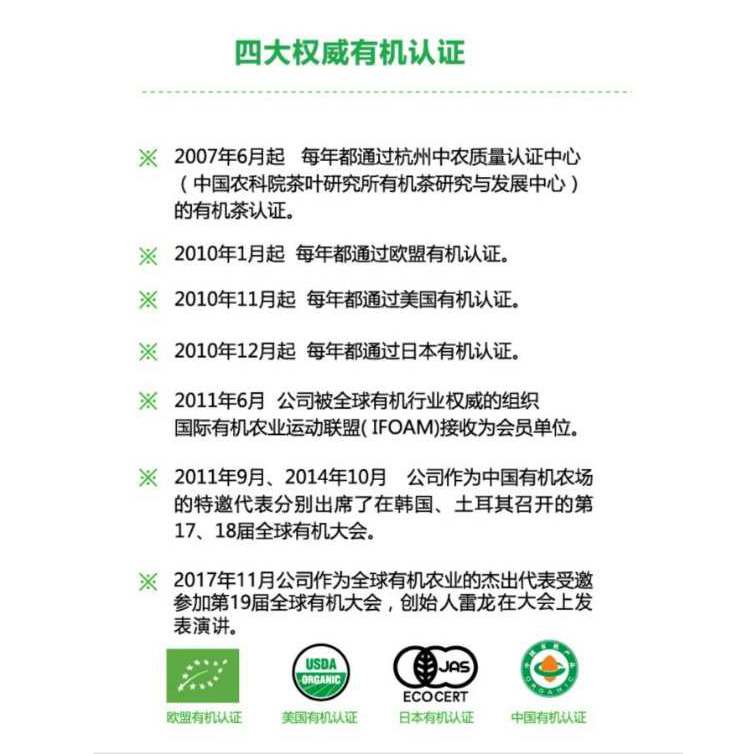 2010年11月 通过欧盟的有机复认证和美国的有机认证