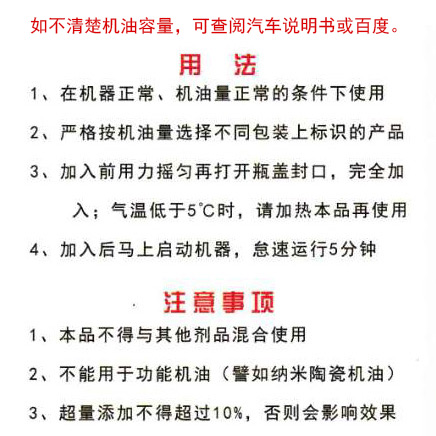 在机油量正常,机器无故障的条件下使用。严格按机油量选择本品包装,摇匀后开封加入机油中,柴油车需按2%的比例计算本品整瓶用量,余数看瓶身刻度按量全部加入机油中,加入后马上启动机器怠速运转5分钟以上。因消除油泥和积碳会牺牲部分剂量,感觉性能不足时应追加相应剂量,汽油车为总剂量的10%,柴油车为总剂量的15%。
