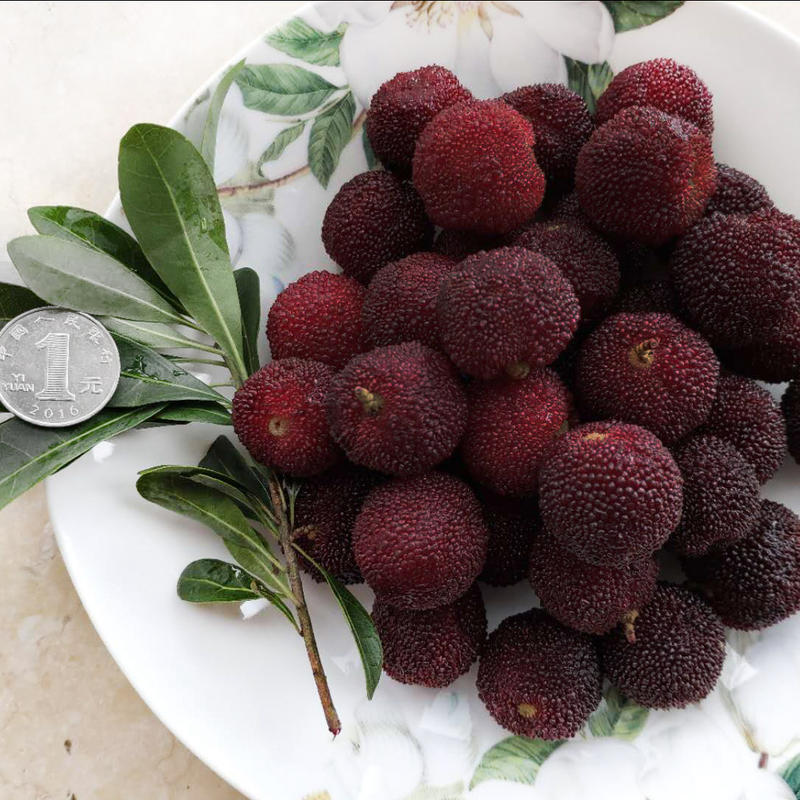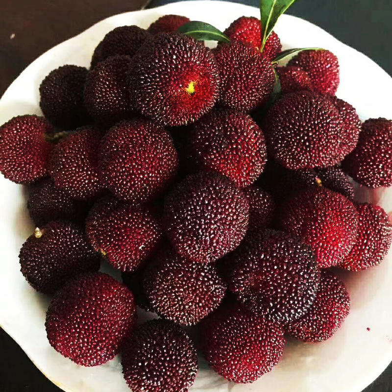 黑炭梅:又称荸荠种杨梅,果形较小,平均重约10克。色泽乌黑透红,肉质细软,肉厚汁多,味甜微酸,有香气,核小,可食率高达96%。